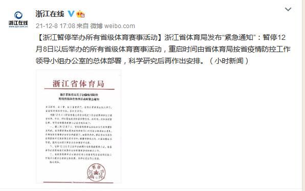 【浙江暂停举办所有省级体育赛事活动】浙江省体育局发布“紧急通知”:暂停12月8日以后举办的所有省级体育赛事活动,重启时间由省体育局按省疫情防控工作领导小组办公室的总体部署,科学研究后再作出安排。(小时新闻)